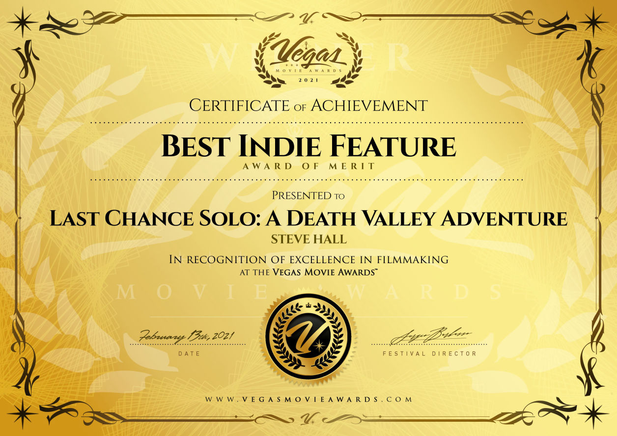Last Chance Solo: A Death Valley Adventure was Winner of Best Indie Feature Award of Merit (Vegas Movie Awards), Silver Award for Documentary Film (Virgin Spring Cinefest), Award Winner (SoCal Film Awards), Honorable Mention (2nd highest award given - Athens International Monthly Art Film Festival) and an Official Selection at Berlin Lift-Off Film Festival.